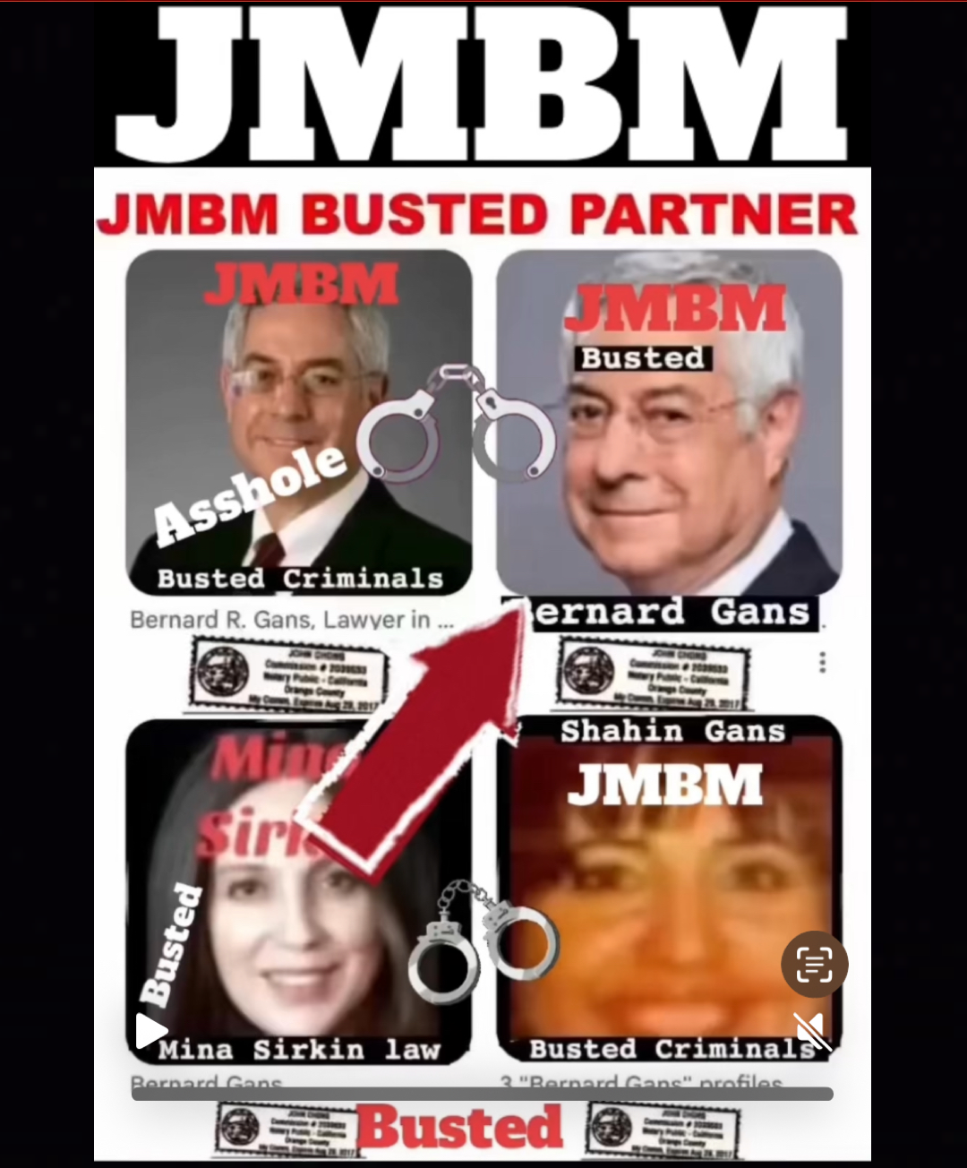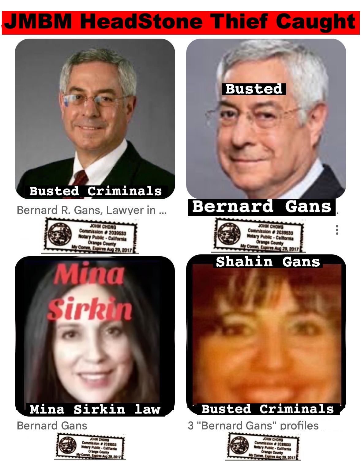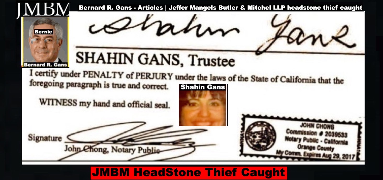 76 year old Century city JMBM busted attorney Bernard Reginald Gans known as Bernie graduate of Santa Barbara university married to Shahin Gans 50 years of success to satisfy his wife he made one stupid mistake and it all crashed down. Well done Bernie well done.Bernard R Gans Articles Jeffer Mangels Butler & Mitchel LLP 76 year old Century city JMBM busted attorney Bernard Reginald Gans known as Bernie graduate of Santa Barbara university married to Shahin Gans 50 years of success to satisfy his wife he made one stupid mistake and it all crashed down. Well done Bernie well done.Bernard R Gans Articles Jeffer Mangels Butler & Mitchel LLP
