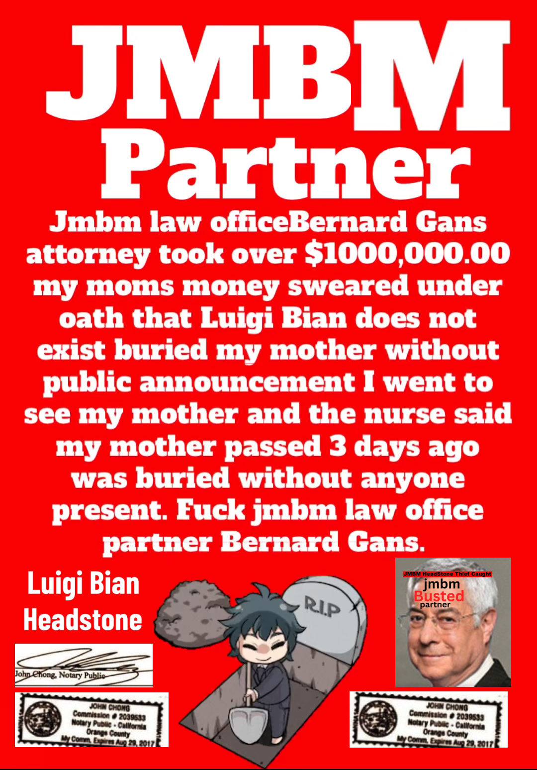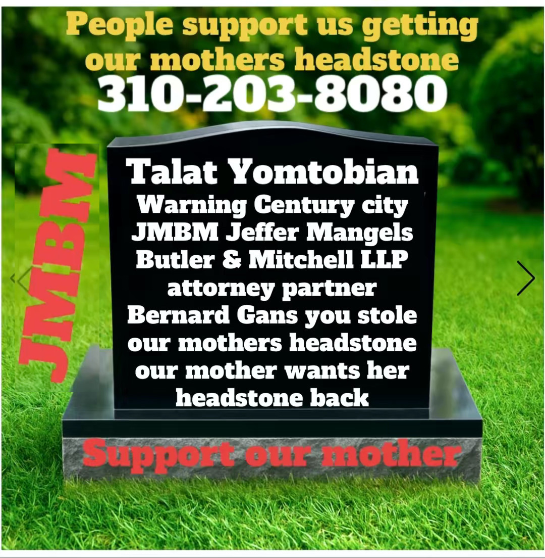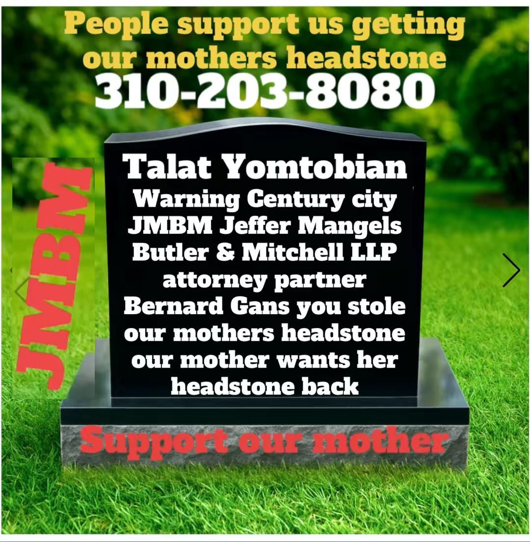 Century City Police 90067 Department JMBM attorney Jeffer Mangels Butler & Mitchel LLP JMBM attorney thief you have 24 hours to place the headstone or we are going to Century City Police department to report your crimes.